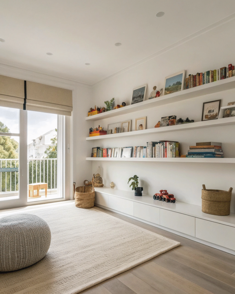 Use minimalist floating shelves to display books and toys without crowding the walls.