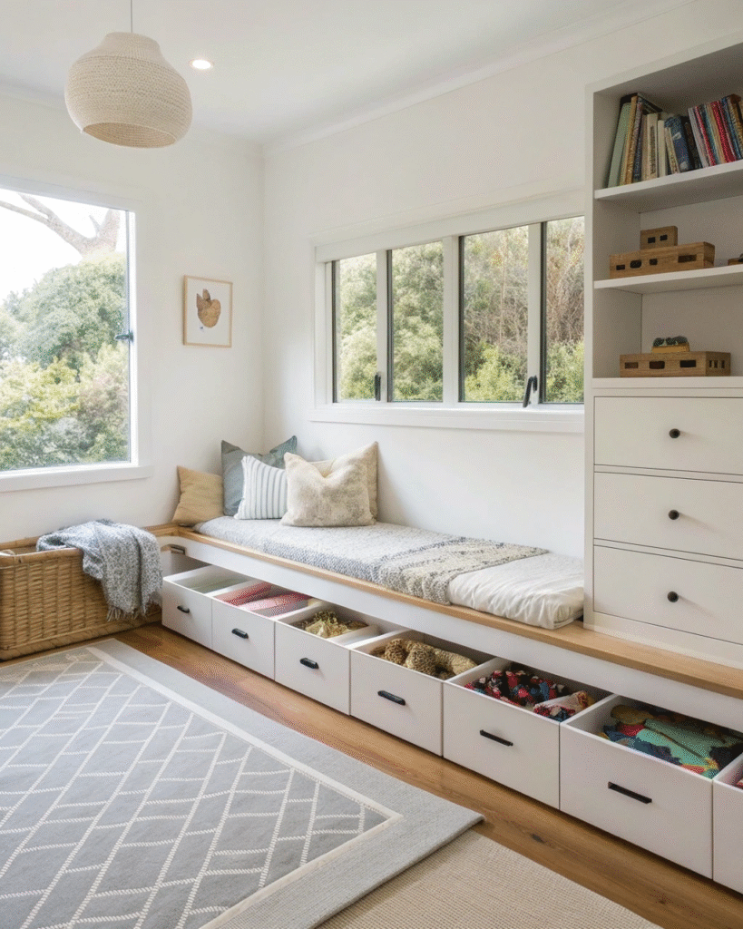 Integrate drawers under the bed or bench seating to keep clutter out of sight.