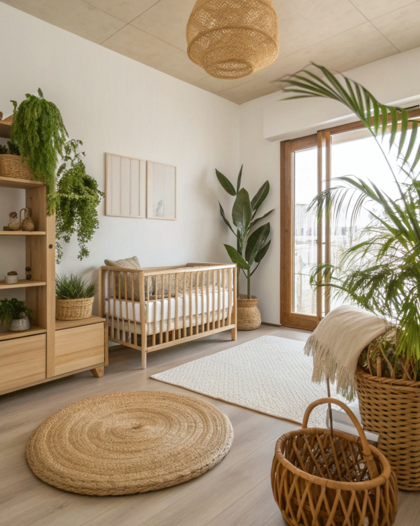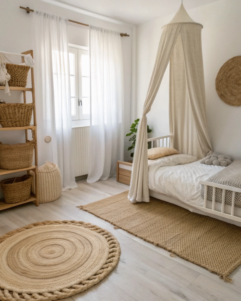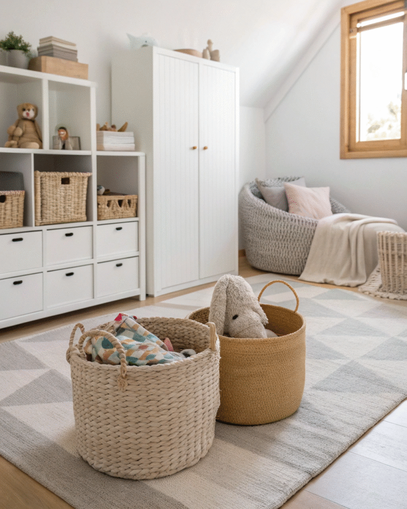 Use woven baskets or fabric bins that blend seamlessly with the room’s palette.