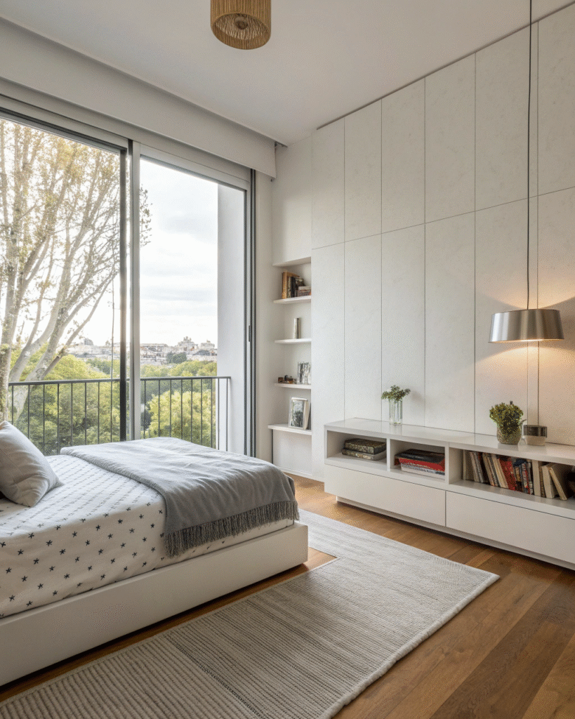 Install a small wall-mounted shelf beside the bed for a sleek, airy feel.