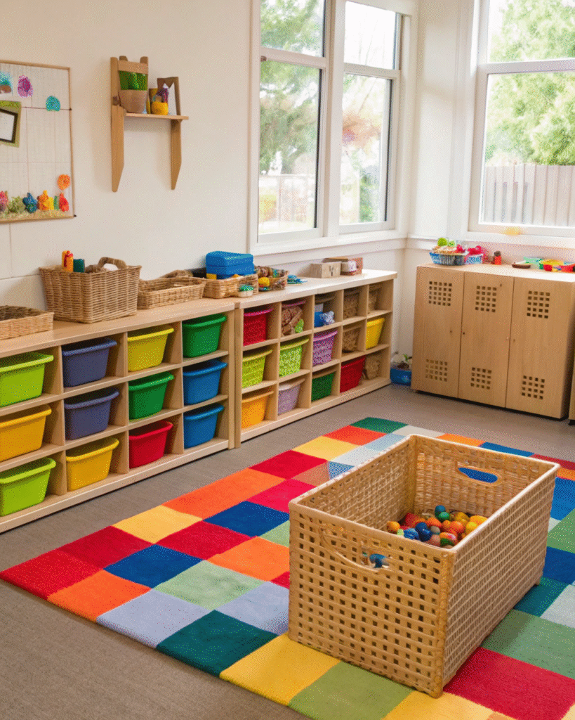 Organize toys in colorful bins or baskets that help kids learn sorting and responsibility.