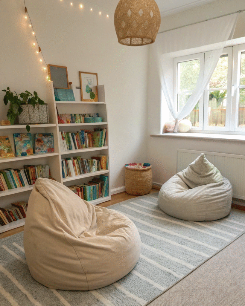 Create a calm nook with bean bags, shelves of books, and soft lighting.