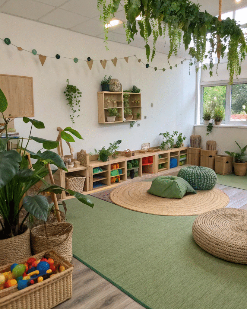 Add plants, natural wood elements, and soft greens to create a peaceful, grounding environment.