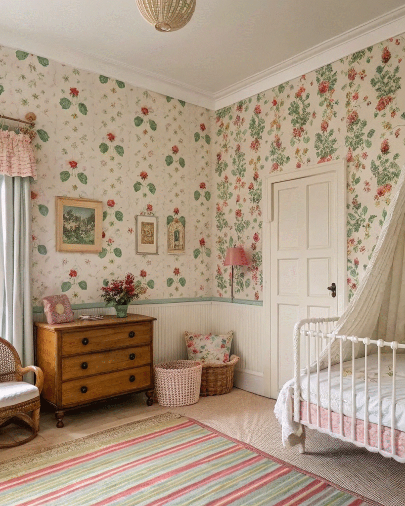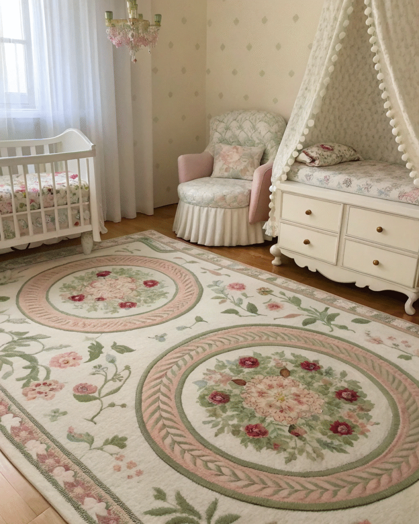 Traditional patterns like medallions or dainty florals ground the space beautifully.