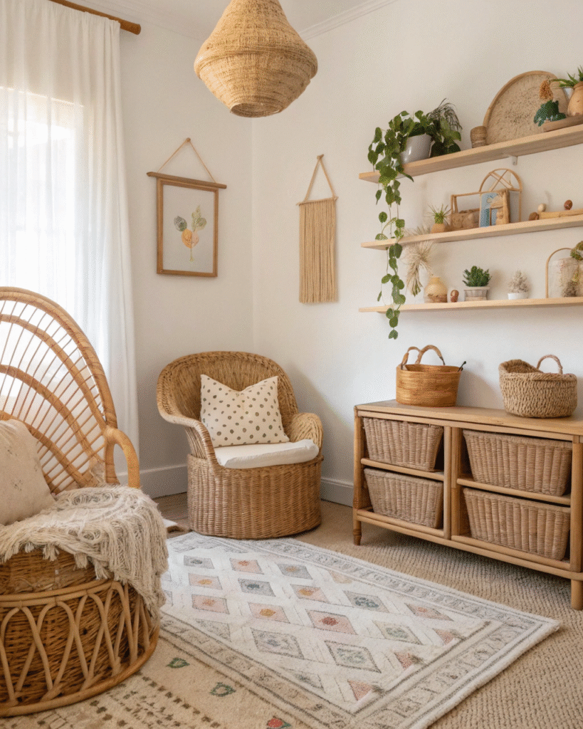 Wicker baskets, rattan chairs, and woven shelves bring natural texture and vintage flair.