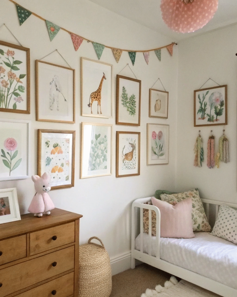 Framed animal prints, nature sketches, or childhood illustrations add personality.