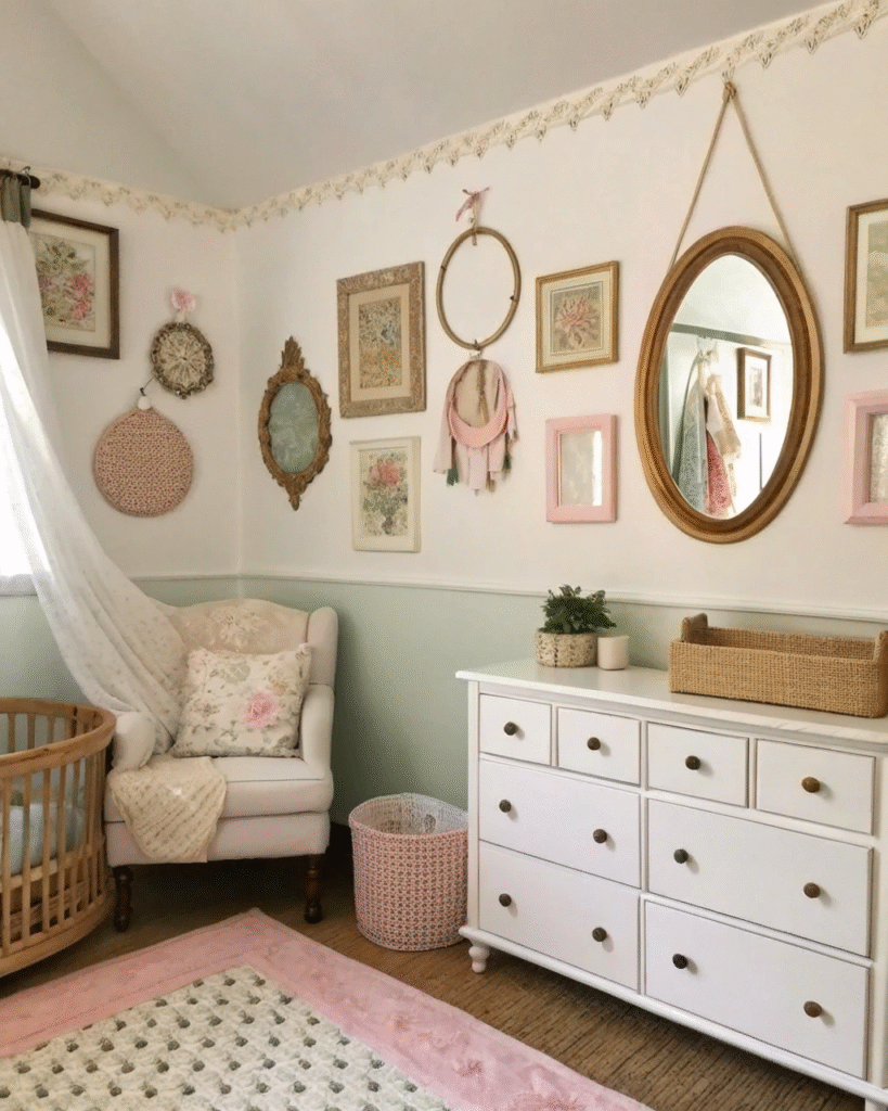 Display vintage mirrors, embroidery hoops, or framed keepsakes to personalize the space.